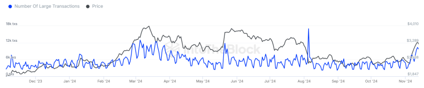 This aligns with on-chain data which reveals that Ethereum whales have been dominating the market this week, with the daily count of large transactions — higher than $100,000 — surpassing 10,000 for the first time since August.