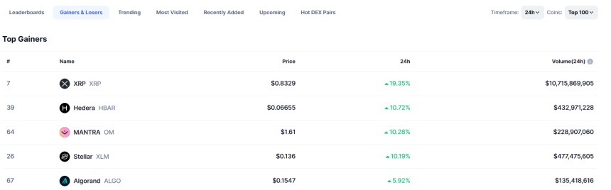 Notably, these projections serve as possibilities rather than guarantees. Interestingly, in the short-term, XRP has 19% over the past 24 hours to trade at $0.8329, while the rest of the market is correcting. XRP is now the top gainer among the 100 largest assets.