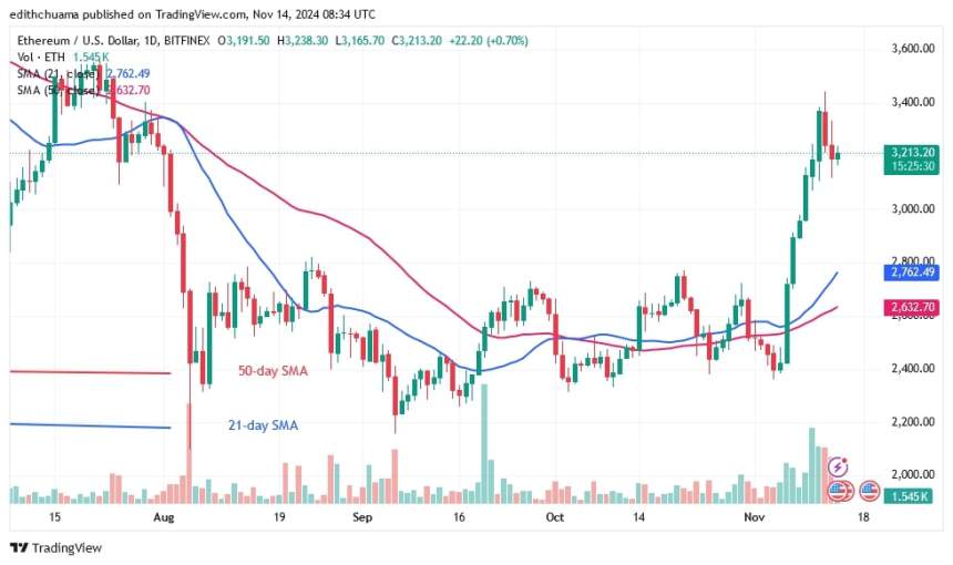 WikiBit 2024-11-15 16:11The price of Ethereum (ETH) reached a high of $3,441 on November 12. The largest altcoin entered the
