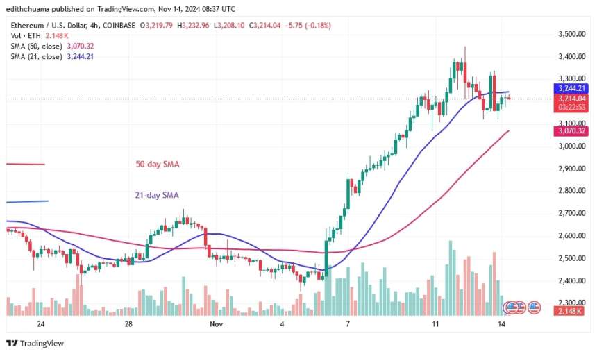 The price of Ethereum (ETH) reached a high of $3,441 on November 12. The largest altcoin entered the overbought zone when it was rejected at $3,400.