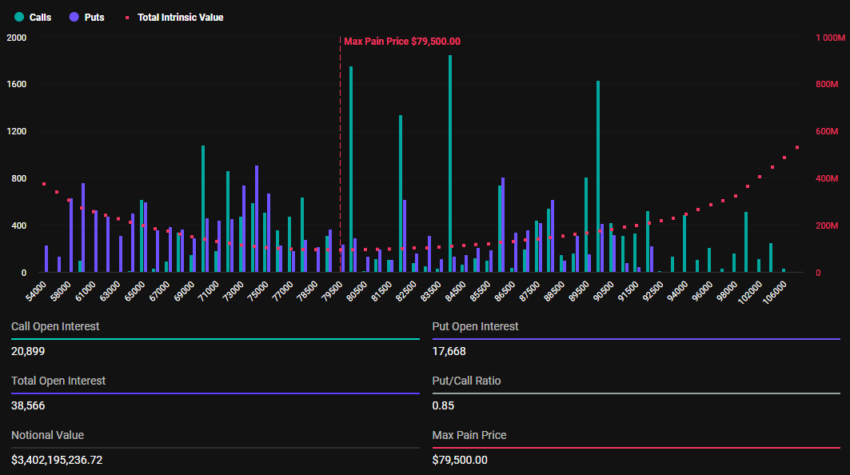 For Bitcoin, the expiring options have a maximum pain price of $79,500 and a put-to-call ratio of 0.85. This indicates a generally bullish sentiment despite the assets recent pullback. In comparison, their Ethereum counterparts have a maximum pain price of $3,000 and a put-to-call ratio of 0.92, reflecting a similar market outlook.