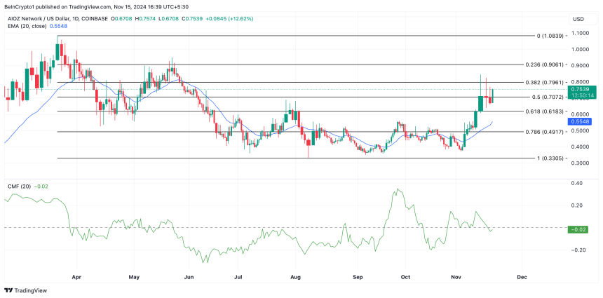 If AIOZ maintains this upward trend, its price may climb toward $0.79. A successful rally past this level may set it on the path to reclaim its year-to-date high above $1.