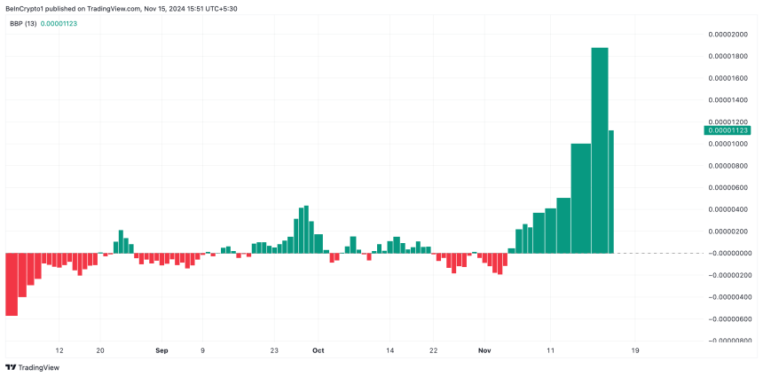 The positive reading from its Elder-Ray Index is one confirmation of this. As of this writing, it stands at 0.000011. For context, yesterday, it rose to 0.000018, its highest level ever.