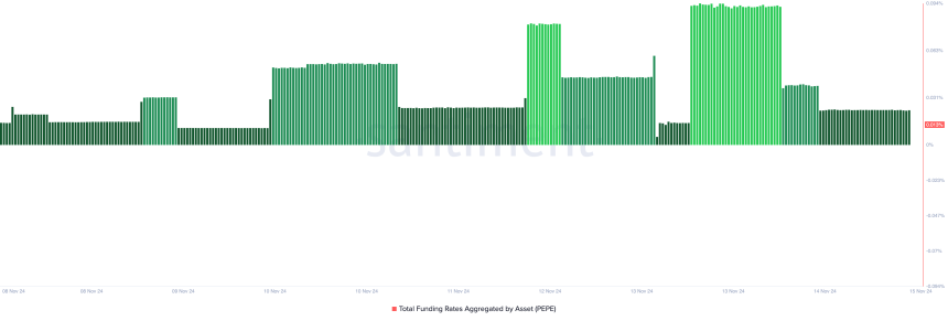 Notably, PEPE‘s funding rate confirms the preference for long positions among its futures traders. Per Santiment, the meme coin’s funding rate, which is the periodic fee paid to keep an assets contract price aligned with its spot price, is 0.013% at press time.