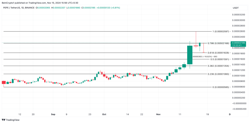 Pepes Coinbase listing pushed its price to an all-time high of $0.000025 yesterday, November 14. However, due to the broader market correction, it has witnessed an 8% pullback over the past 24 hours.