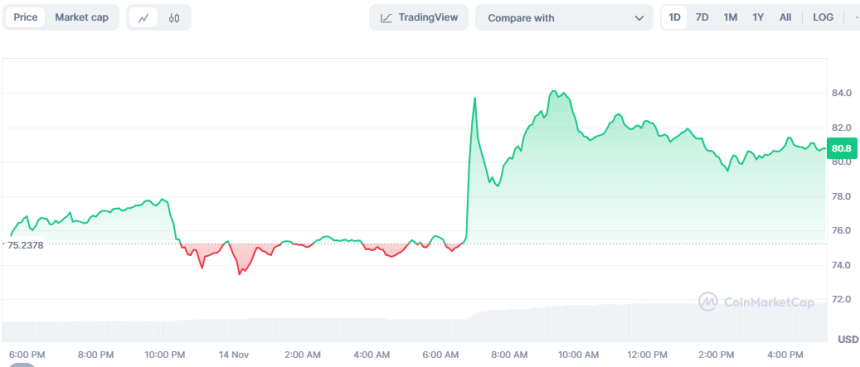 traded between an intra-day high and low of $82.25 and $84.35, respectively.The meme coin status appears in the context of the overall growth of meme tokens. PEPE and WIF recently showing substantial growth and being listed at Coinbase and Robinhood.