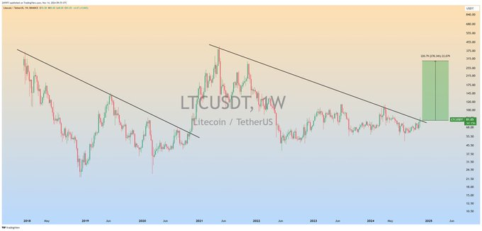 “With Litecoin miner reserves being depleted to levels not seen since 2012, it could be a wild ride for Litecoin this cycle as money flows out of Bitcoin into altcoins,” Trade Pro added, emphasizing the potential for a sustained rally.