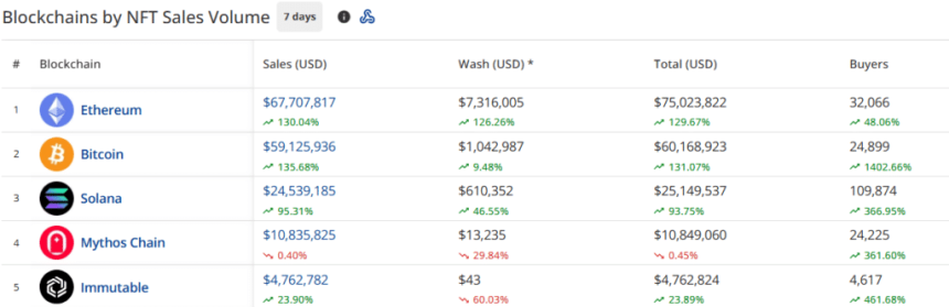 The Ethereum NFT blockchain sales volume reached $67.5 million this week, showing a 130% increase in the last seven days. Notably, the number of NFT buyers on the Ethereum blockchain grew to 32,064, marking a 48.03% rise.