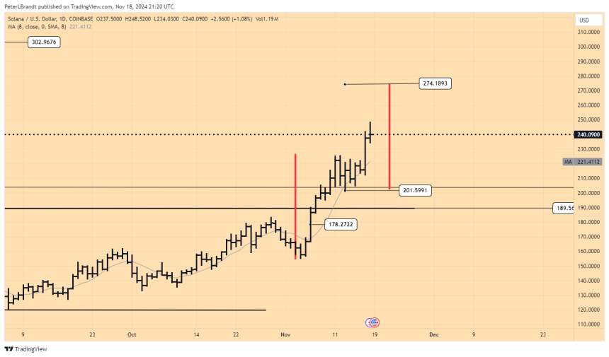 As a result, Brandt noted that Solana may be on the path of a similar uptrend with its latest swing. In an accompanying chart, the analyst shows that the ongoing swing started at $201, speculating that it would propel the asset past its current all-time high of $260.06 to $274.