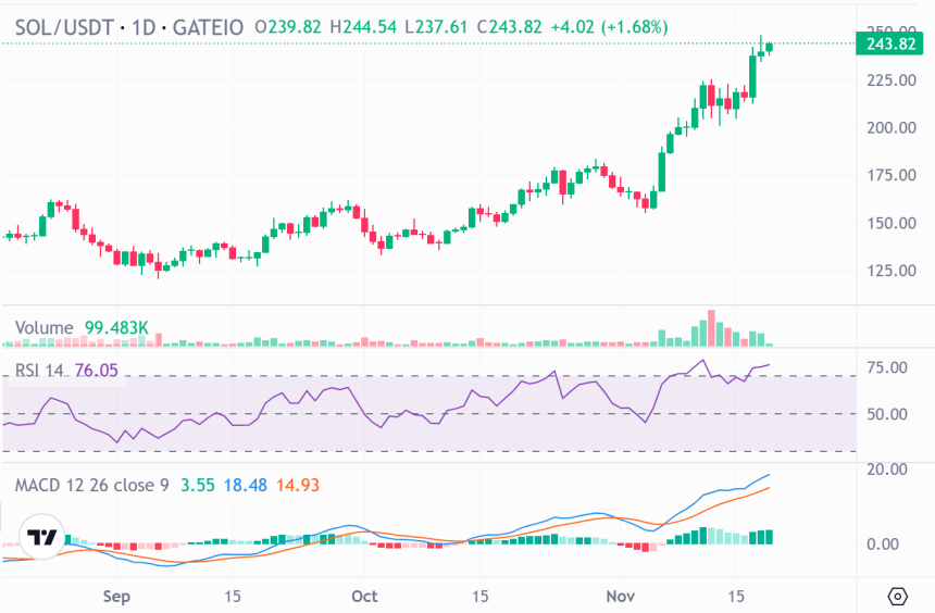 Solana defied the consolidation phase prevalent in the broader crypto market when it surged considerably on Sunday. The bullish momentum spilled into the new week, with the Solana price reaching a peak of $248.