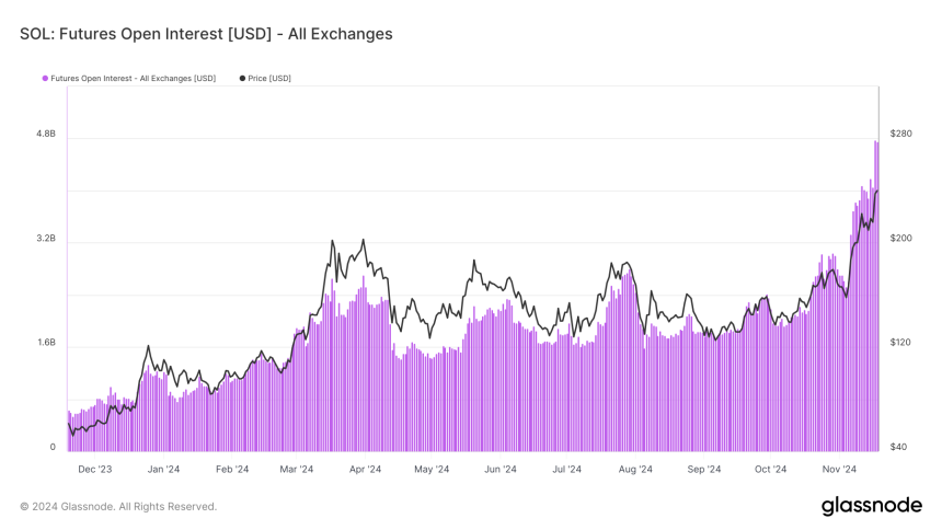 Solana traders exhibit strong optimism, with the assets Futures Open Interest (OI) reaching a record $4.7 billion. This surge highlights increasing confidence among traders as they pour significant capital into SOL amid its ongoing rally. With OI nearing $5 billion, Solana is experiencing a notable rise in market participation, reflecting heightened anticipation for further gains.