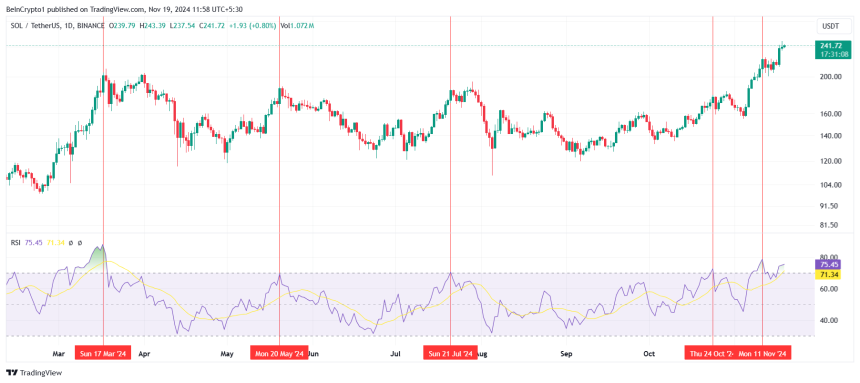 From a technical perspective, Solanas Relative Strength Index (RSI) indicates overbought conditions, sitting well above the neutral range. Historically, such RSI levels have triggered price corrections, suggesting SOL may face short-term headwinds. A dip in price could materialize as traders adjust positions and secure profits, pulling the asset away from its all-time high ambitions.