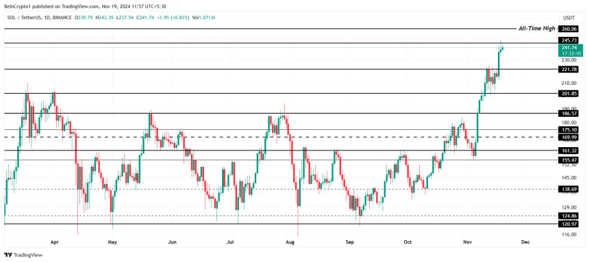 Solana‘s price is trading just below the $245 resistance level, which serves as the final barrier to a new ATH beyond $260. Breaching this critical level would confirm the continuation of SOL’s rally, allowing the asset to set new milestones.