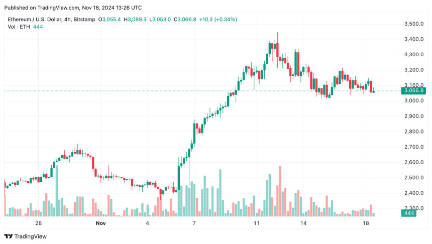 ETH/USD 4-hour chart via Bitstamp on Nov. 18, 2024.