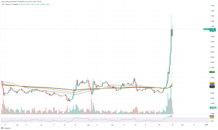 Positive sentiment and rising trading volume have combined to push the asset above important resistance levels such as $1 and $0.70. Strong buying momentum accompanied this breakout, as seen by the daily chart's RSI above 85, which shows that the asset is in overbought territory but is still being driven by demand.