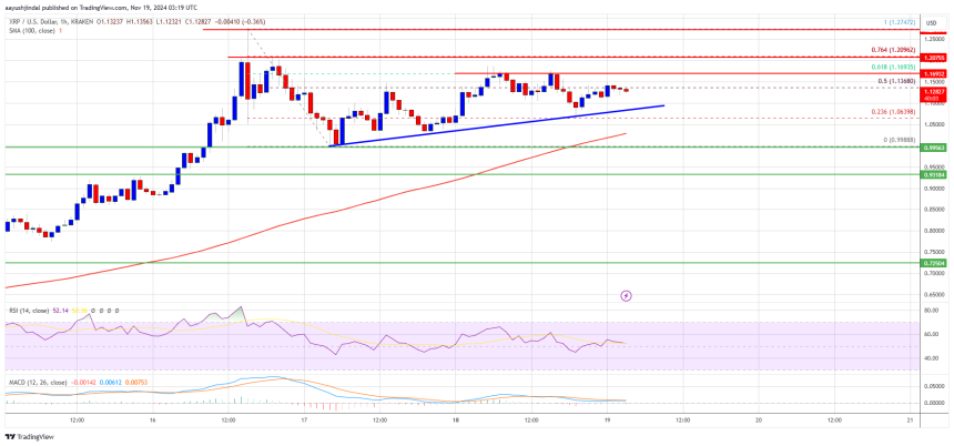 XRP price is consolidating gains above the $1.050 support zone. The price could soon aim for more gains above the $1.180 resistance zone.