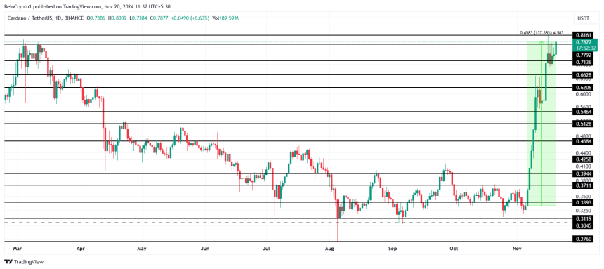 Cardano (ADA) has witnessed a remarkable rally over the past two weeks, climbing to an eight-month high. With the price hovering near $0.80, the altcoin has captured the attention of investors.