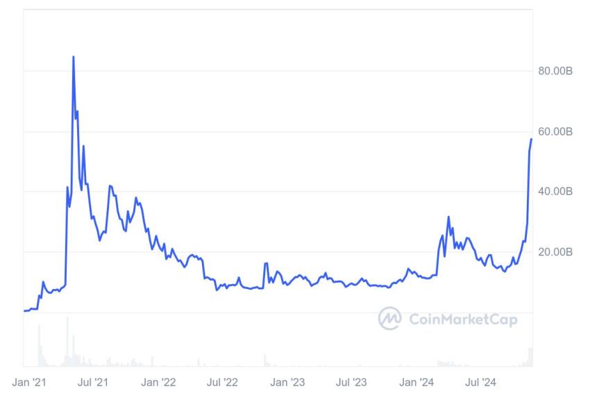 Dogecoin's market cap tests highest level since 2021. Source: CoinMarketCap.com