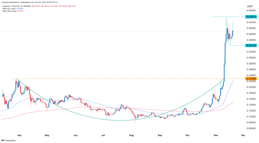 Dogecoin (DOGE) was trading at $0.3850 on Wednesday, Nov. 20, slightly below its year-to-date high of $0.4387.