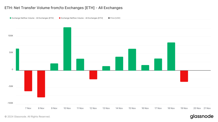 Ethereums Net Flow From/To Exchanges has shown notable fluctuations in recent weeks. Between November 13 and November 18, the net flow was consistently positive, peaking at 83,500 on November 18.