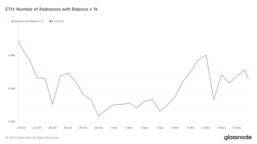 However, the number dropped sharply on November 14 to 5,534 and has struggled to recover since then. Currently sitting at 5,542, the metrics ups and downs indicate lingering uncertainty among whales. Their hesitance suggests that they are unsure of ETH price potential for sustained surges in the near term.