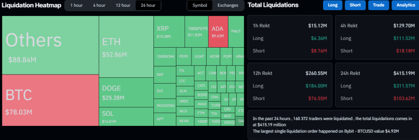CoinGlass data shows that the total value of wrecked positions in the past 24 hours equal $415 million, with longs responsible for the lions share ($311 million). BTC is not in the first position, as others – most likely lower-cap memes, have taken the lead. North of 160,000 traders were liquidated within this timeframe.