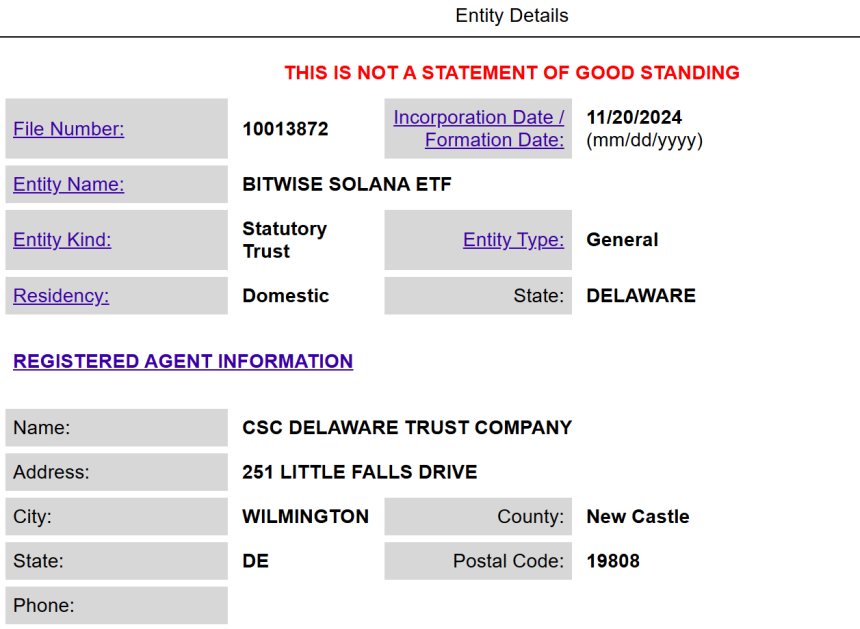 Bitwise Asset Management has filed to establish a trust entity for its proposed Bitwise Solana ETF in Delaware—a preliminary step in the process of launching the ETF, which signals a potential submission to the SEC for regulatory approval.