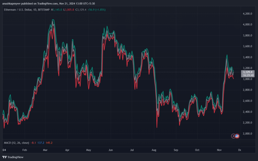 The Moving Average Convergence Divergence indicator for ETH also points to some momentum struggles at critical resistance levels. Meanwhile, the Altcoin Season Index, which currently scores 28, shows that the market is not favoring altcoin. The drop in market cap of altcoins compared to Bitcoin further indicates that liquidity is shifting from altcoins, including ETH, towards BTC.