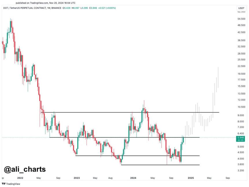Top crypto analyst Ali Martinez recently shared his insights on X, pointing to Polkadots weekly price chart as evidence of its potential. According to Martinez, DOT has shown remarkable strength by holding above the $3.6 support level, which has served as a foundation for its recent recovery. He suggests that if the current momentum continues, DOT could climb to $11 in the coming weeks, representing a substantial gain from current levels.