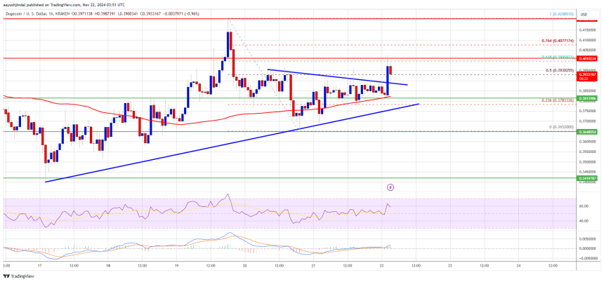 Dogecoin price is now trading above the $0.3750 level and the 100-hourly simple moving average. Immediate resistance on the upside is near the $0.3950 level or the 61.8% Fib retracement level of the downward move from the $0.4208 swing high to the $0.3652 low.