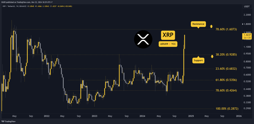 XRP just had one of the best months in years, and its price increased by 74% this week alone, bringing it close to $1.5. In the last bull market, XRP reached almost $2 before sellers took over the price action.
