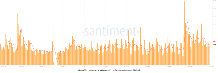 OP 7-day moving average of daily active addresses was 14,200 as of November 21.