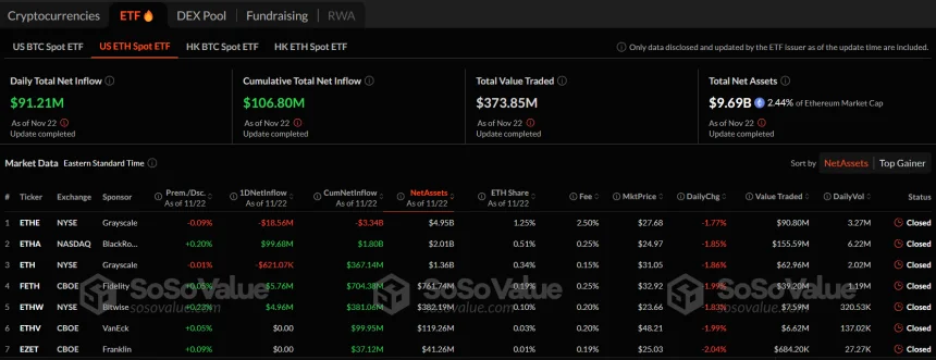 WikiBit 2024-11-23 18:05Ethereum Spot ETF inflows surged to $91.2 million, reversing six consecutive days of outflows. Black