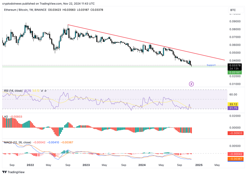 Ethereum slipped to a low of 0.03187 against Bitcoin on Friday, November 22. As Bitcoin made its way towards the $100,000 target,