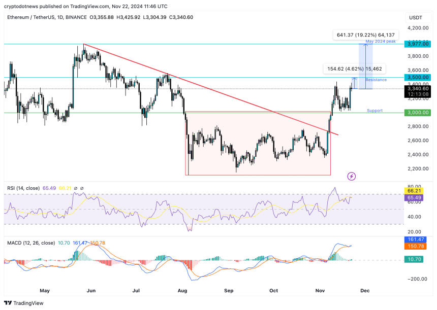 The ETH/USDT daily price chart shows positive signs for the altcoin. ETH price could observe gains and rally towards the $3,500 resistance and the May 2024 peak of $3,977 if the altcoin maintains its upward momentum.