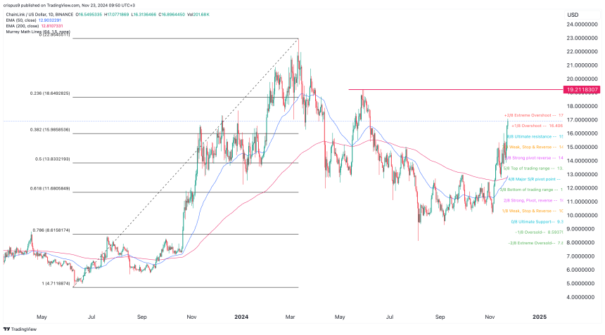 The daily chart shows that the LINK price has formed a rare golden cross pattern as the 50-day and 200-day Exponential Moving Averages (EMA) crossed each other. This is one of the most bullish patterns in the market in most periods.