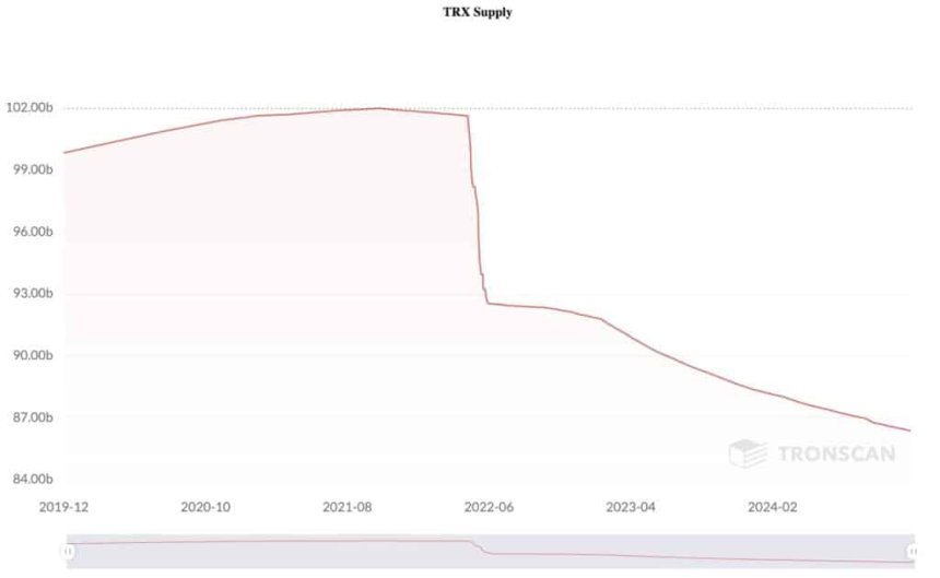 Second, Tron has been a highly deflationary token whose supply has been in a downward trend. As shown below, TRX had over 101 billion tokens in circulation in 2022, a figure that has dropped to 86 billion. This trend is expected to continue as its ecosystem growth accelerates.