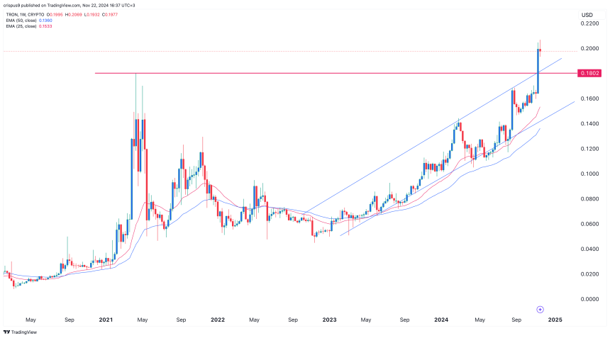 Tron also has strong technicals that could push it higher to $1 in the coming months. On the daily chart above, the coin moved above the key resistance level of $0.1800 last week. This was an important price since it was its previous all-time high. It was also the upper side of the ascending channel shown in blue.