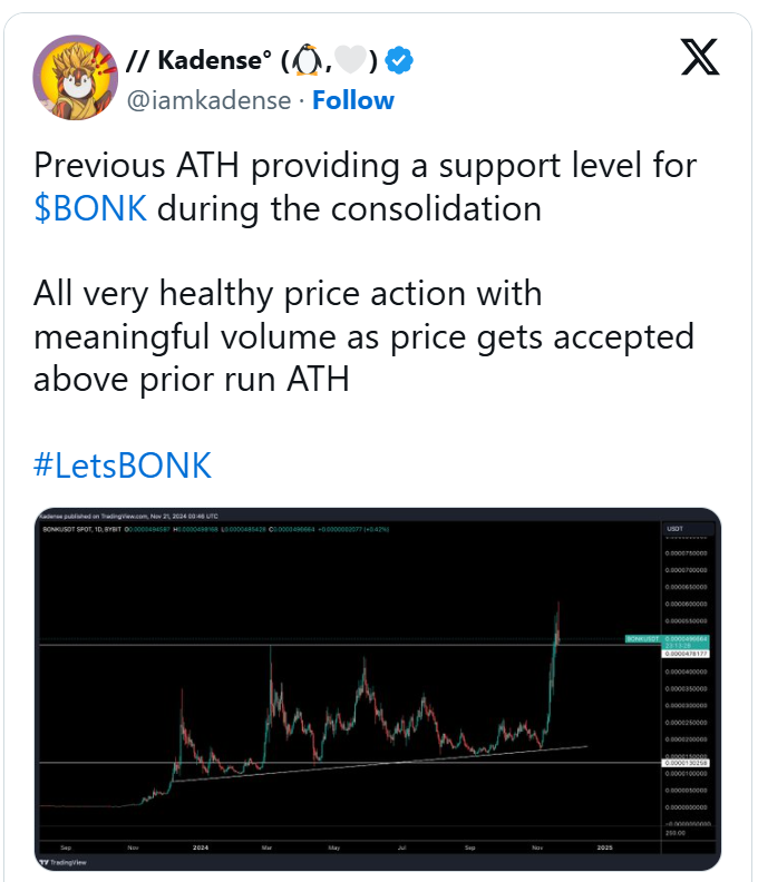 As per analyst ‘Iamkadense’s‘ chart, a breakout above the ATH of $0.00004781 is likely to be a major turning point for BONK’s price action. The analyst also highlighted that this has now become a support level.