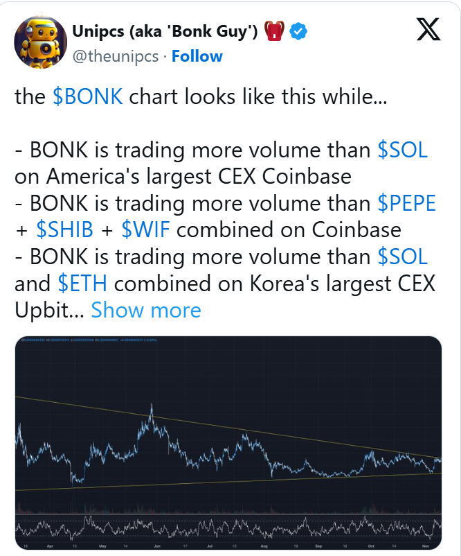 On Coinbase, BONK has been trading far more compared to other popular tokens such as $SOL, $SHIB, $PEPE, and $WIF.