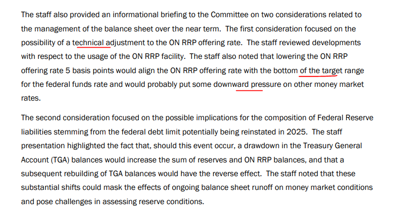 Given the recent uptake in the Standing Repo Facility that occurred at the end of the previous quarter, paired with FOMC members acknowledging that the clock is ticking on how much longer QT can continue without potential strain showing up in the monetary plumbing system, the FOMC might be trying to get ahead of this by encouraging outflows from the RRP and increasing bank reserves to provide ample liquidity.