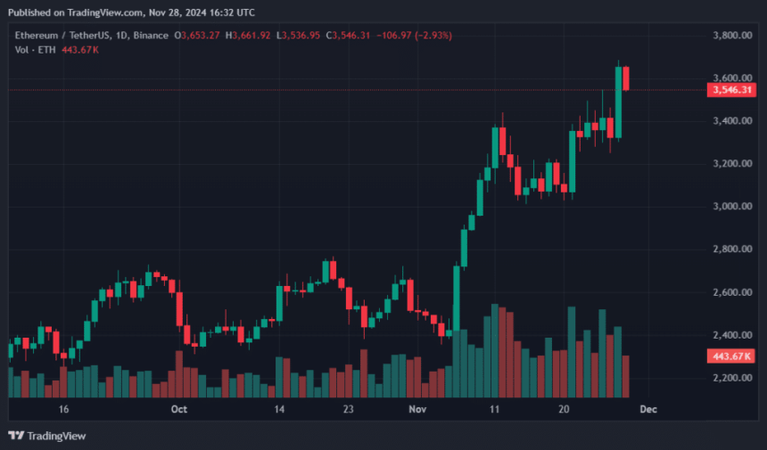 Ethers price experienced an uptick alongside other cryptocurrencies after the Nov. 6 U.S. general elections. As the total crypto market whipsawed to $3.4 trillion, ETH rose to $3,550. The token was around 28% off its previous all-time high of $4,878.