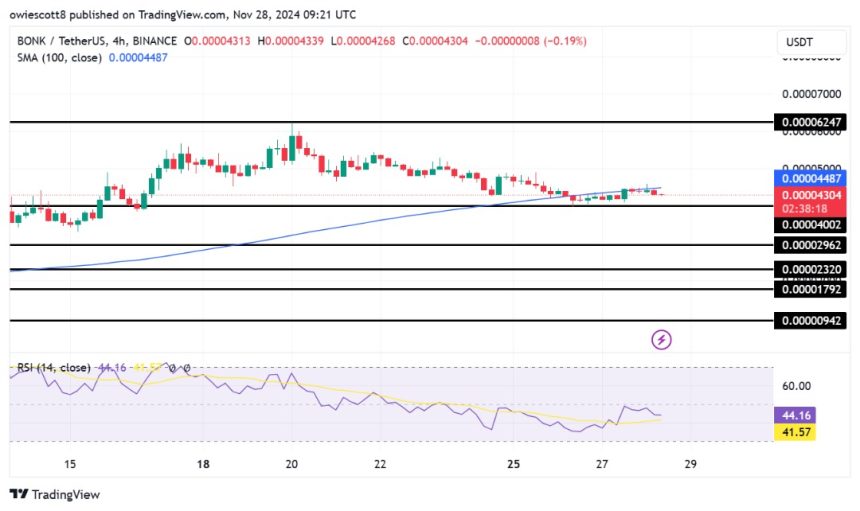 On the 4-hour chart, BONK exhibits negative sentiment, trading below the 100-day Simple Moving Average (SMA) as it trends downward toward the $0.00004002 support level. A continued descent to this support suggests that selling pressure is intensifying, and if the support fails to hold, the asset could experience more declines.