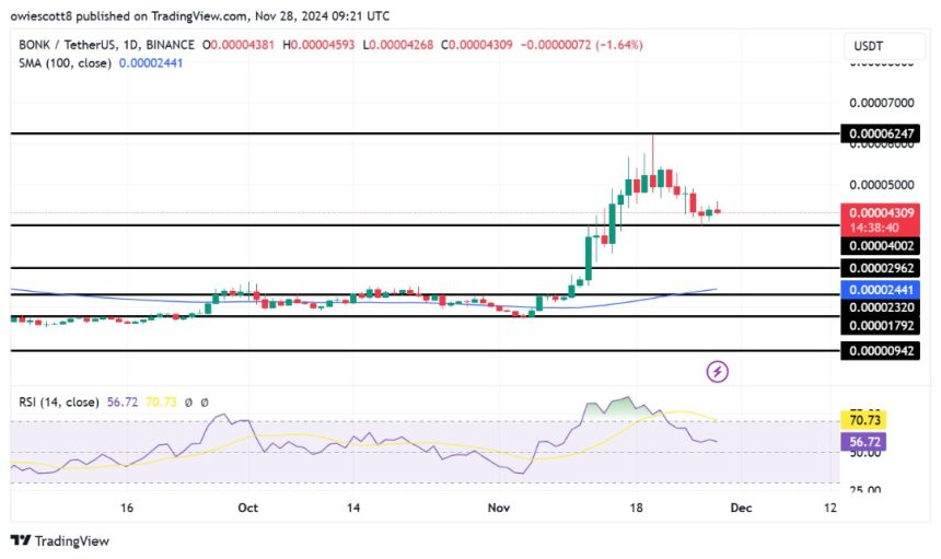 This analysis dives into BONK‘s current market performance under bearish conditions, highlighting the technical indicators that signal potential weakness. Furthermore, we will assess the likelihood of a recovery or a continuation of BONK’s downward trajectory by analyzing critical support levels, market trends, and the broader outlook,