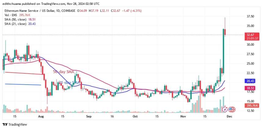 Ethereum Name Service (ENS) is on the upswing after a period of decline. The altcoin has returned above the moving average lines three times, but buyers have not been able to sustain the positive momentum above the current high. Today, the uptrend reached a high of $37. ENS is likely to reach a high of $84 if the current trend continues.
