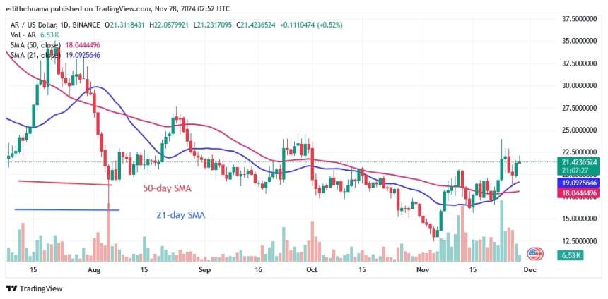 The price of Arweave (AR) has rallied above the moving average lines, but the positive momentum has been halted twice by resistance at $24. There are extended candle tails indicating resistance at $24. The wicks show strong selling pressure at the recent high. The altcoin is trading above the moving average lines but below the resistance of $22.