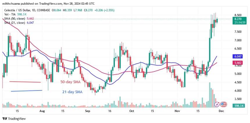 On November 21, the altcoin rallied and broke through the moving average lines and the $6.50 resistance level. TIA rose to a high of $8.93 before falling back. The altcoin is trading below $8.50 in anticipation of a positive trend.