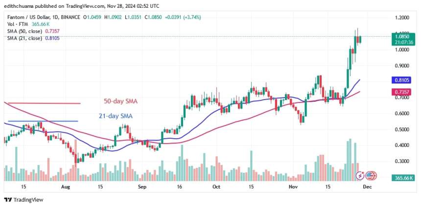 The price of Fantom (FTM) is trading at the bottom of the chart but has risen above the moving average lines. The price of the cryptocurrency is forming a series of higher highs and higher lows. The resistance of $1.20 has halted the rally and upward movement twice. The bullish momentum was maintained above the moving average lines but below the $1.10 resistance level. The price fluctuation was caused by the presence of doji candlesticks.