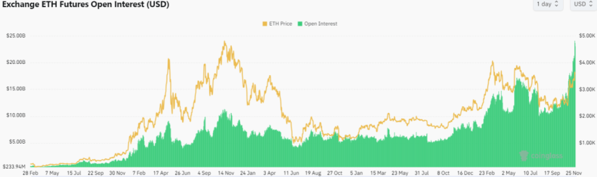 According to data from CoinGlass, there are now $23 billion worth of ETH futures open interest, suggesting a growing amount of positions are being created on the cryptocurrency as fresh capital flows into the market.