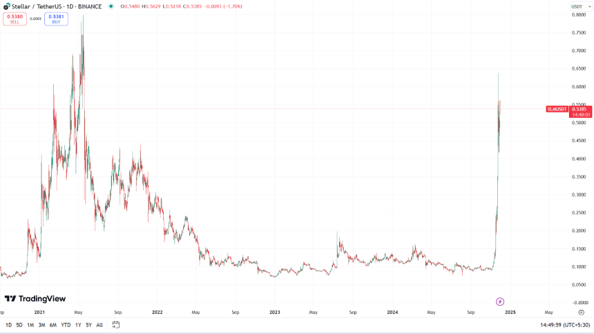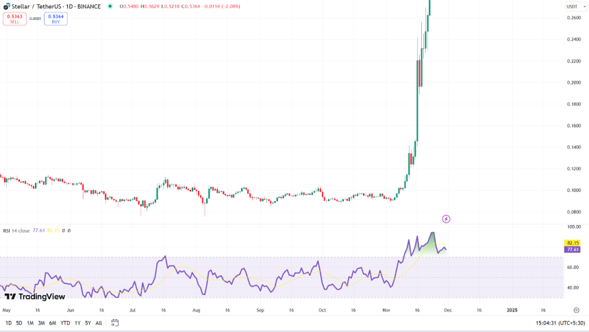 At the start of this month (November, 2024), the XLM market was at $0.0933. Since November 5, the market has surged by over 492.54%. During this upward momentum, the market experienced only one major correction; it was when the price sharply dropped from $0.5359 to $0.4384 between November 25 and 26, marking a 18.19% fall.